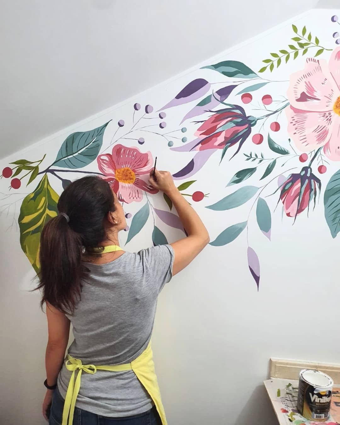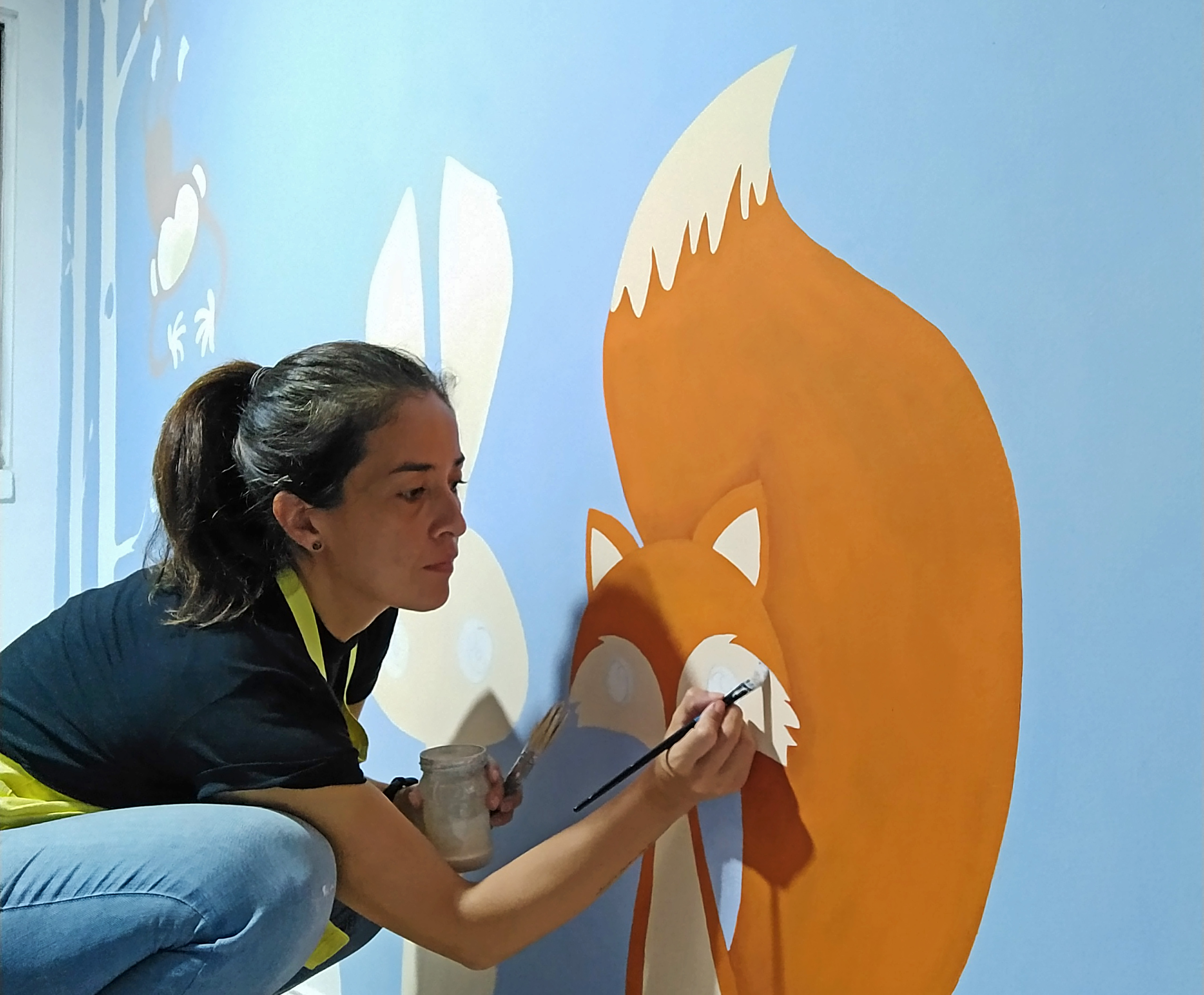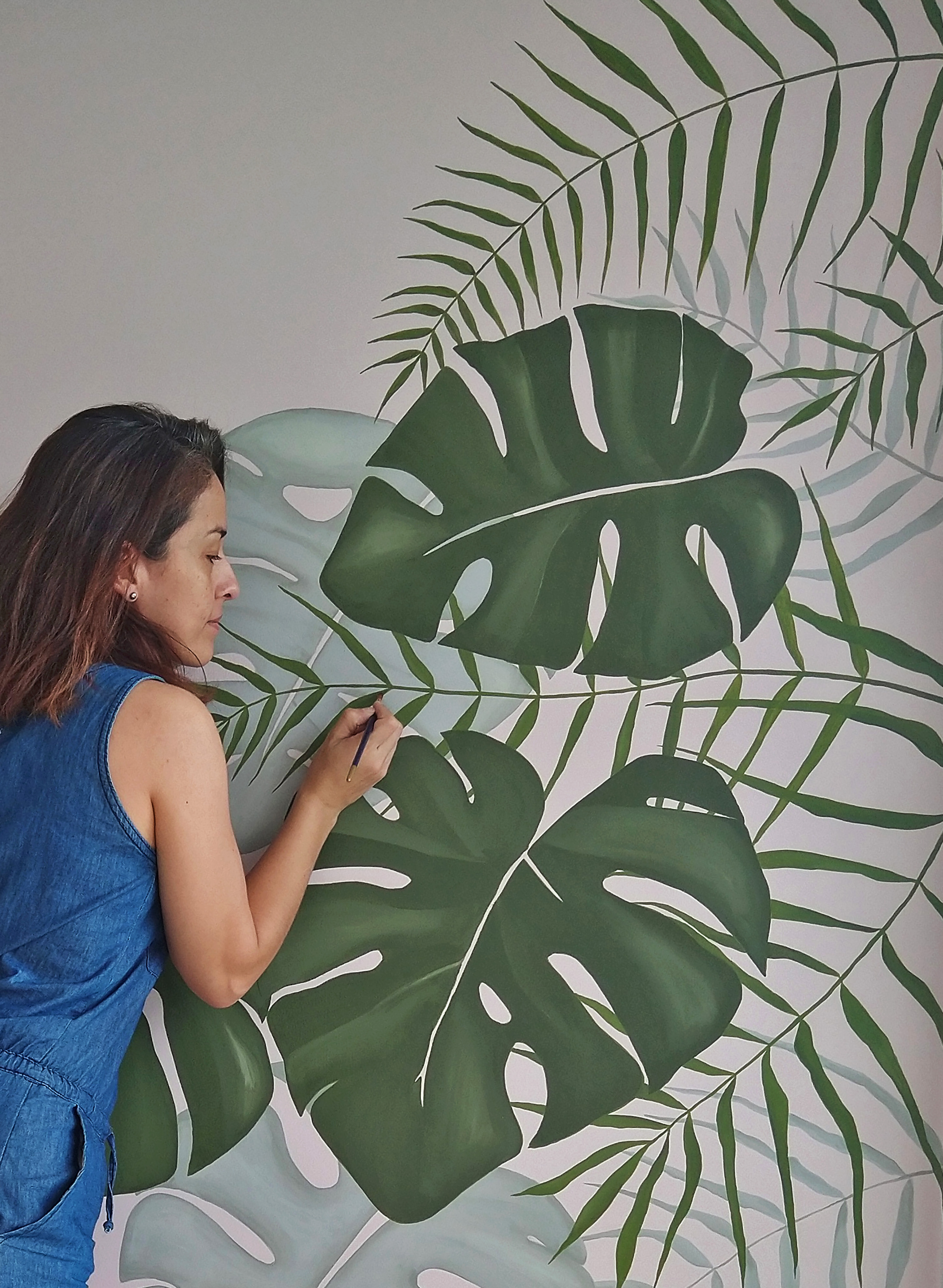 Es espectacular llevar las cosas a un formato mucho más grande… pero eso no es lo mejor. Me siento agradecida por tener las puertas abiertas para dejar un pedacito de mí en el hogar de otras familias, eso le ha dado mucho más valor al disfrute que me produce el olor a pintura y el pincel dejando trazos en la pared.