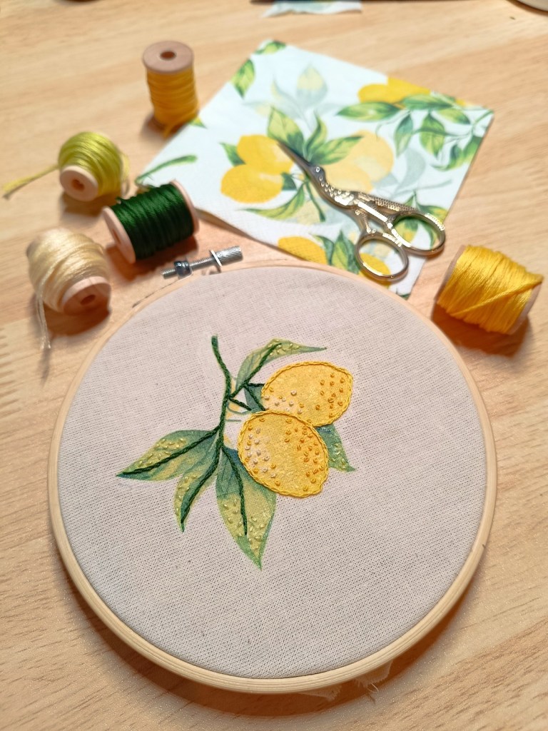 Hagamos un poco de magia textil. En este taller quiero mostrarte una nueva forma de crear arte con hilos, dando un uso diferente a diseños pensados para otros propósito. Vamos a transferir a la tela los frutos que hacen parte del diseño de una servilleta, para después decorarlos usando puntadas básicas de bordado.